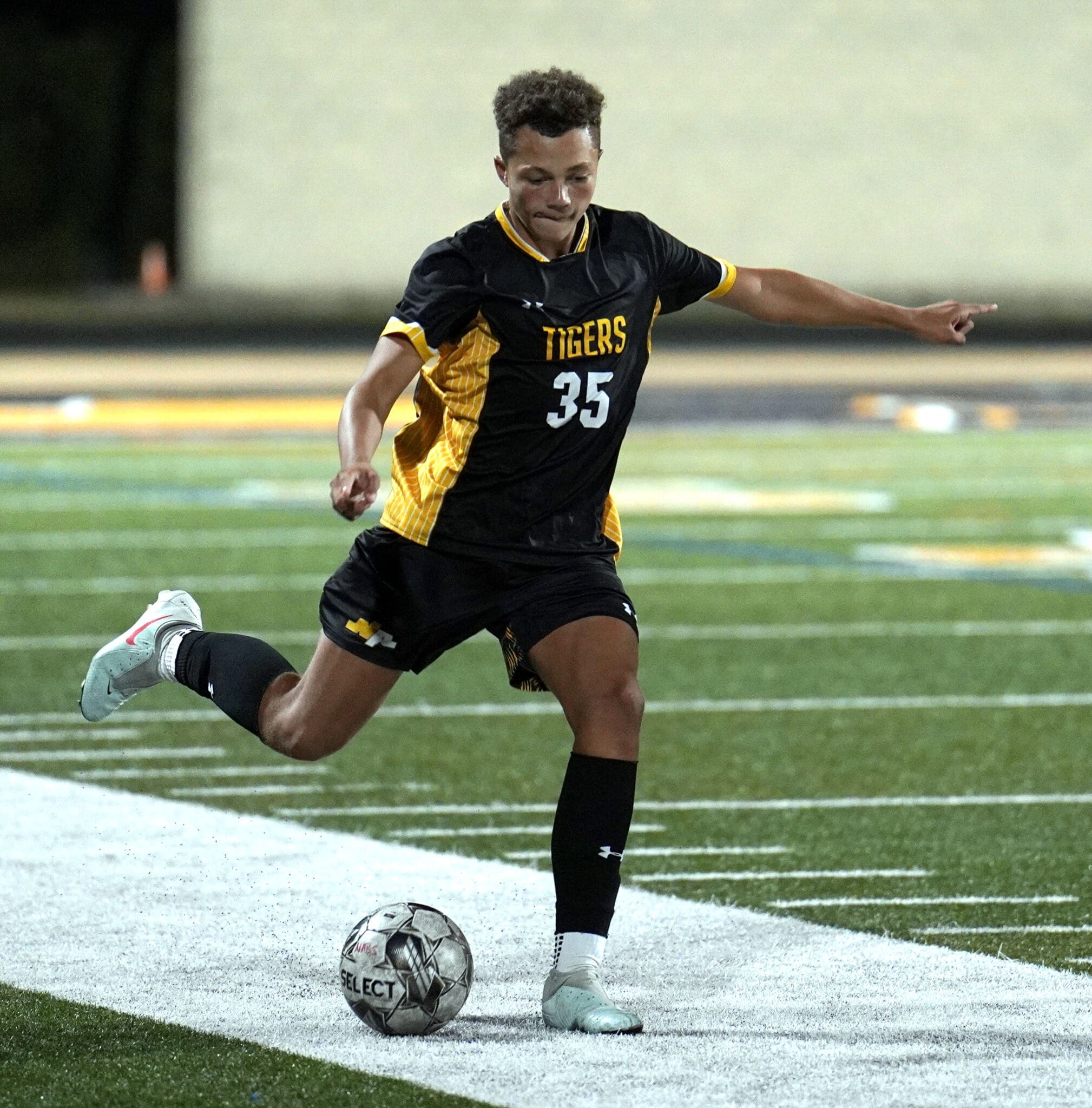 Soccer player in black and yellow jersey kicks ball on green field, wearing number 35.