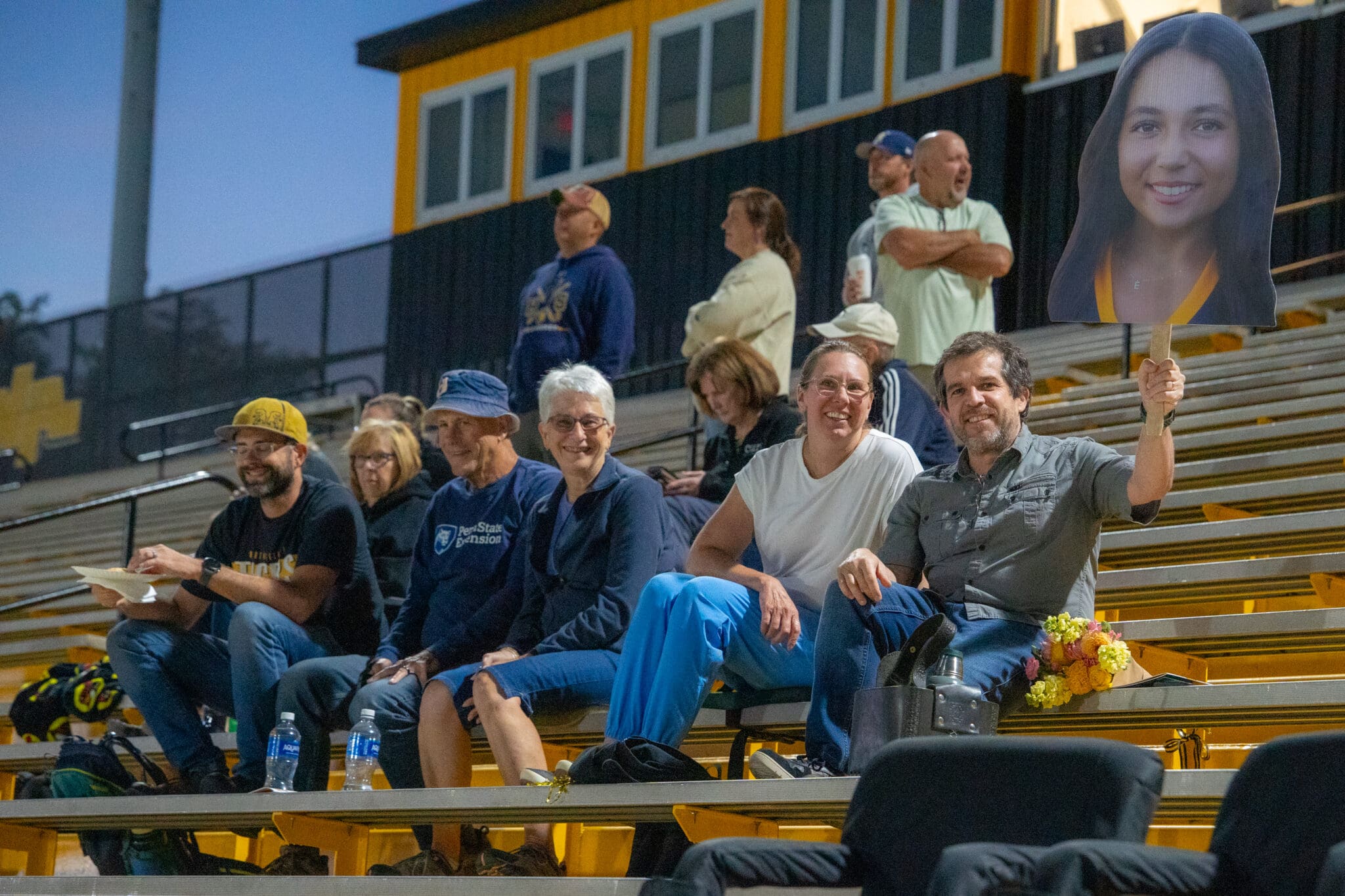 People enjoying a sports event, one holding a large face cutout, seated on stadium bleachers at night.