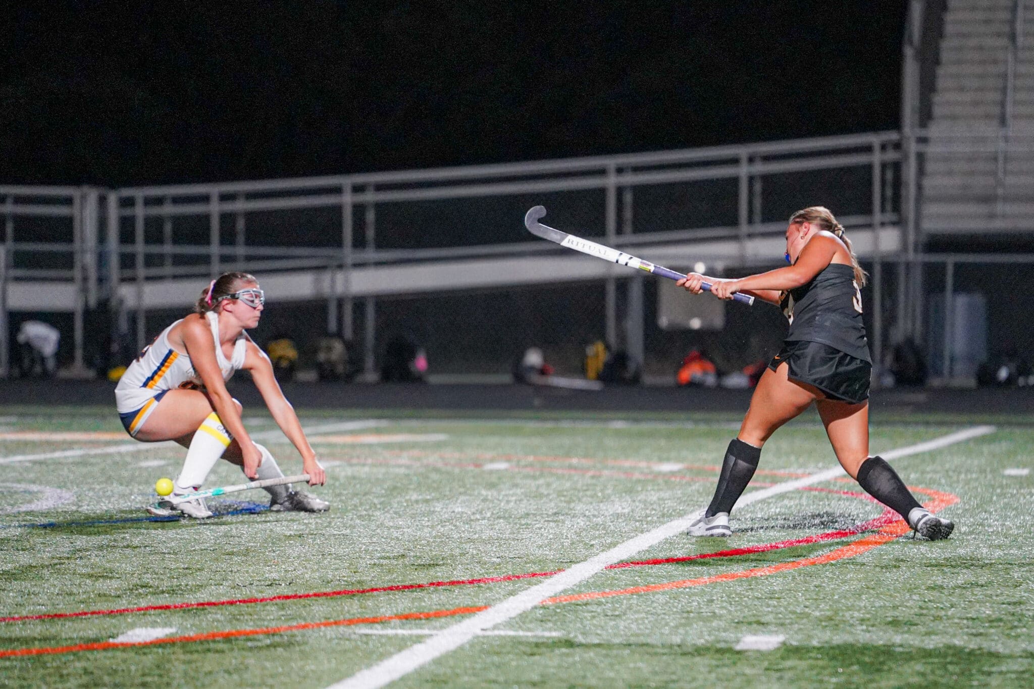 Two field hockey players in action on a night game, one striking the ball, the other defending.