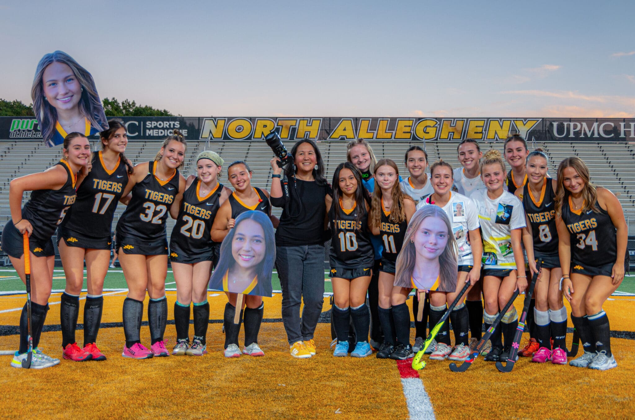 North Allegheny field hockey team poses on the field with their coach, holding posters of teammates in black uniforms.