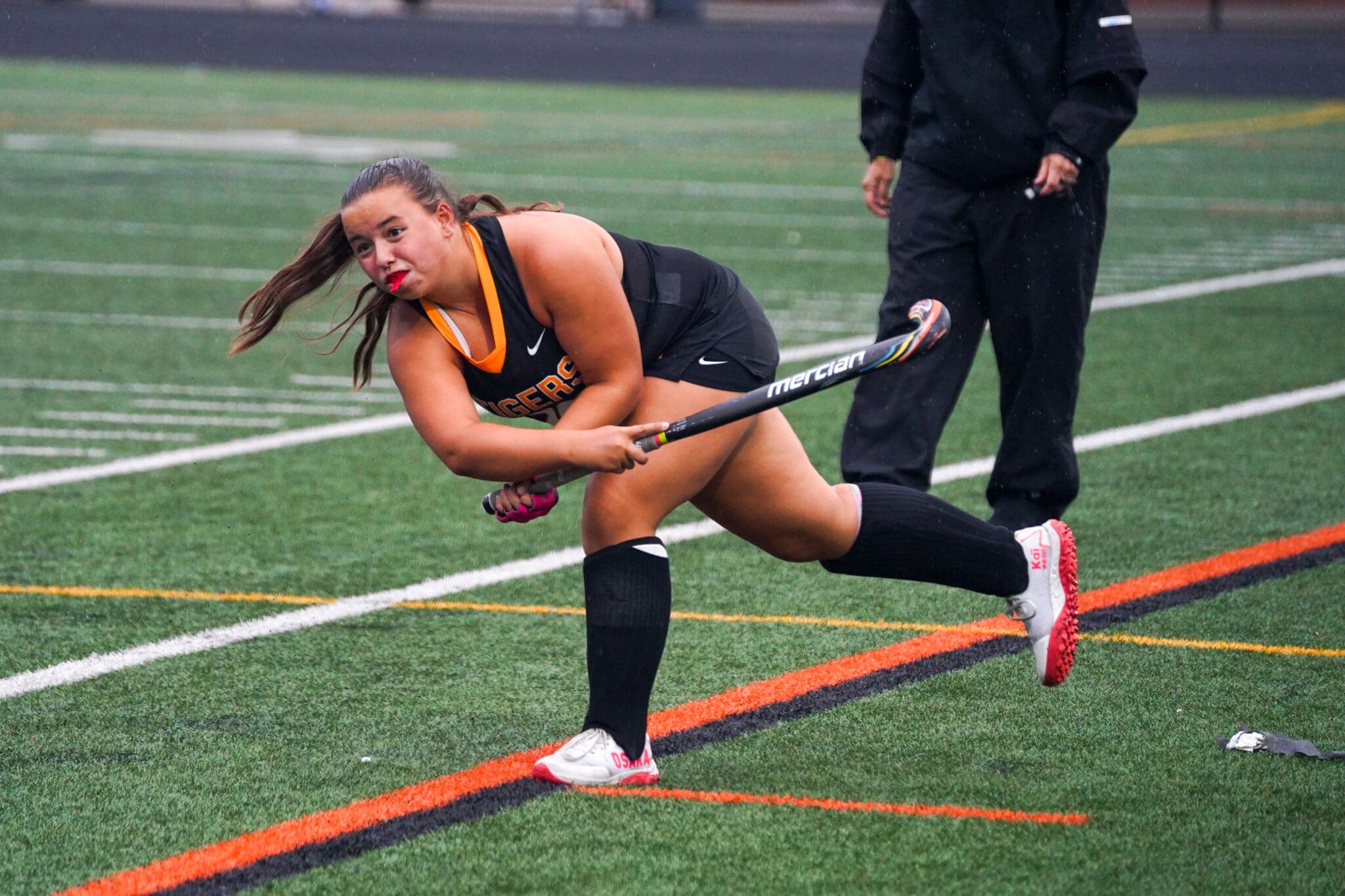Field hockey player in action, focused during match on a green turf field, wearing a black uniform.