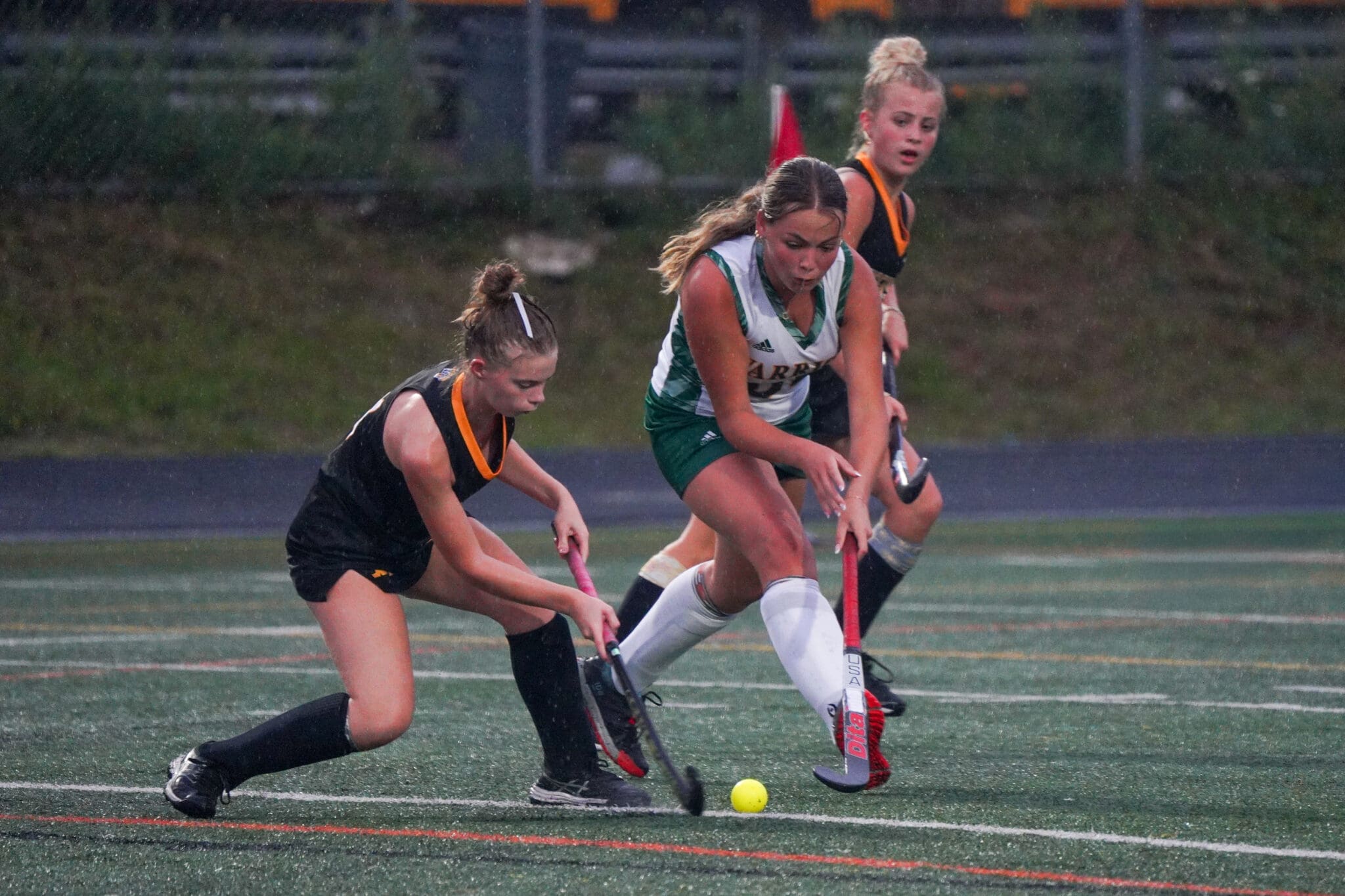 Girls playing field hockey in rain, focus on action and teamwork on wet turf.