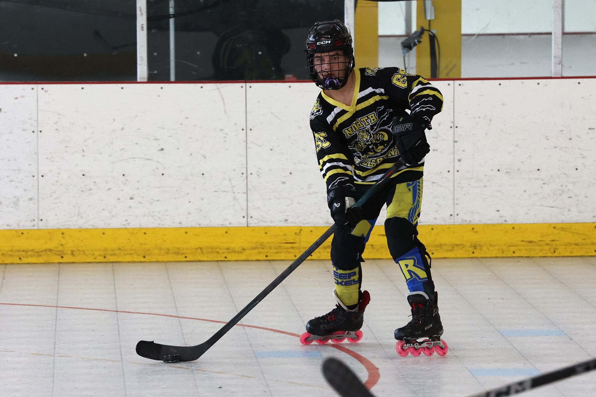 Roller hockey player with stick in action on indoor rink, wearing yellow and black gear.