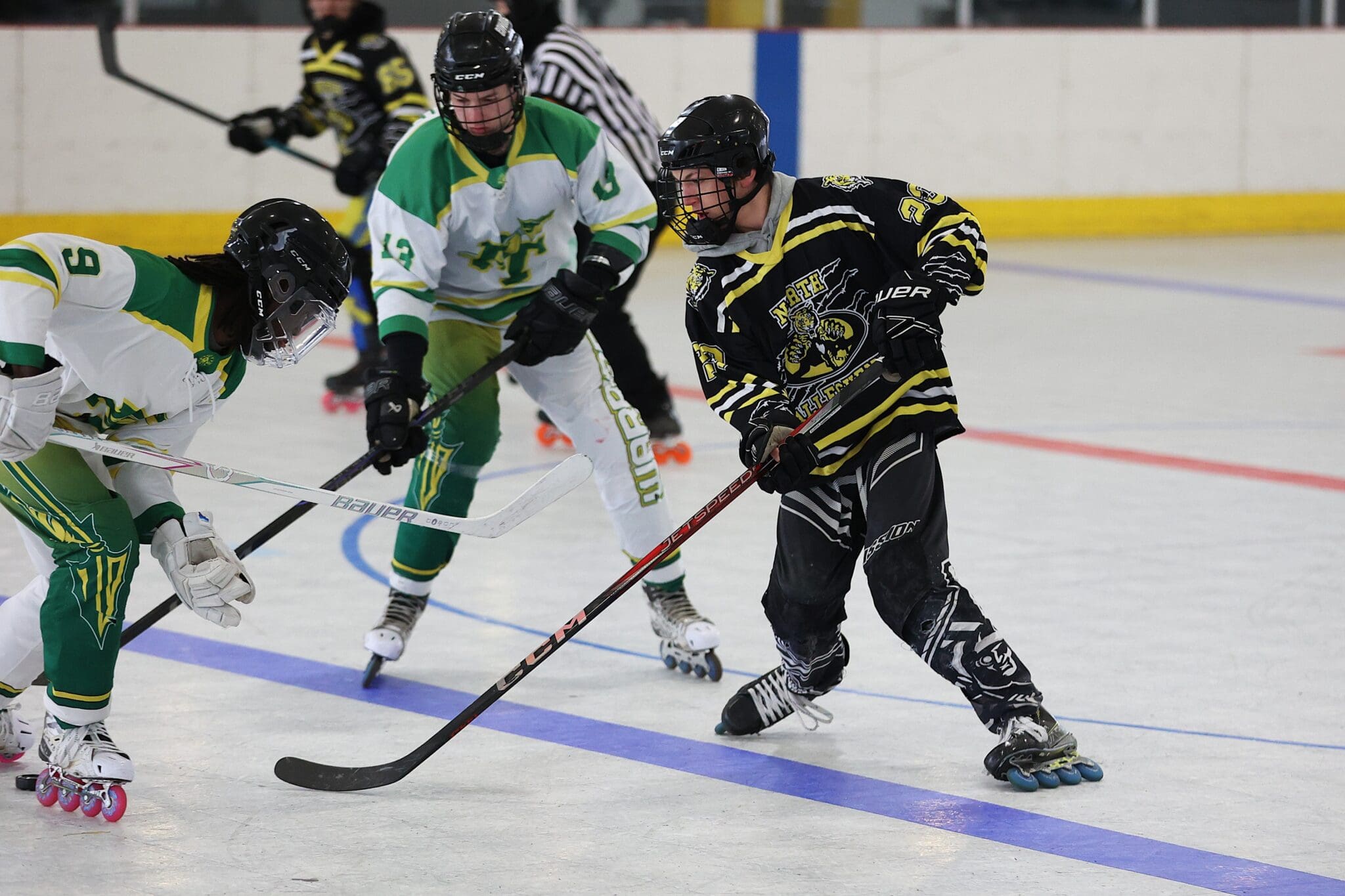 Roller hockey players in intense action on the rink; focused on stick handling and competition.