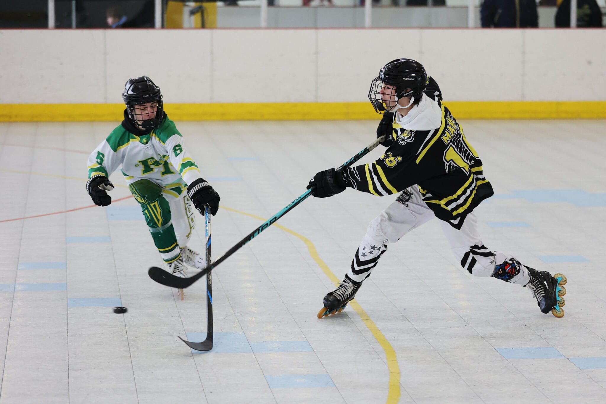 Two junior hockey players in action at an indoor roller hockey game, focusing on the puck.