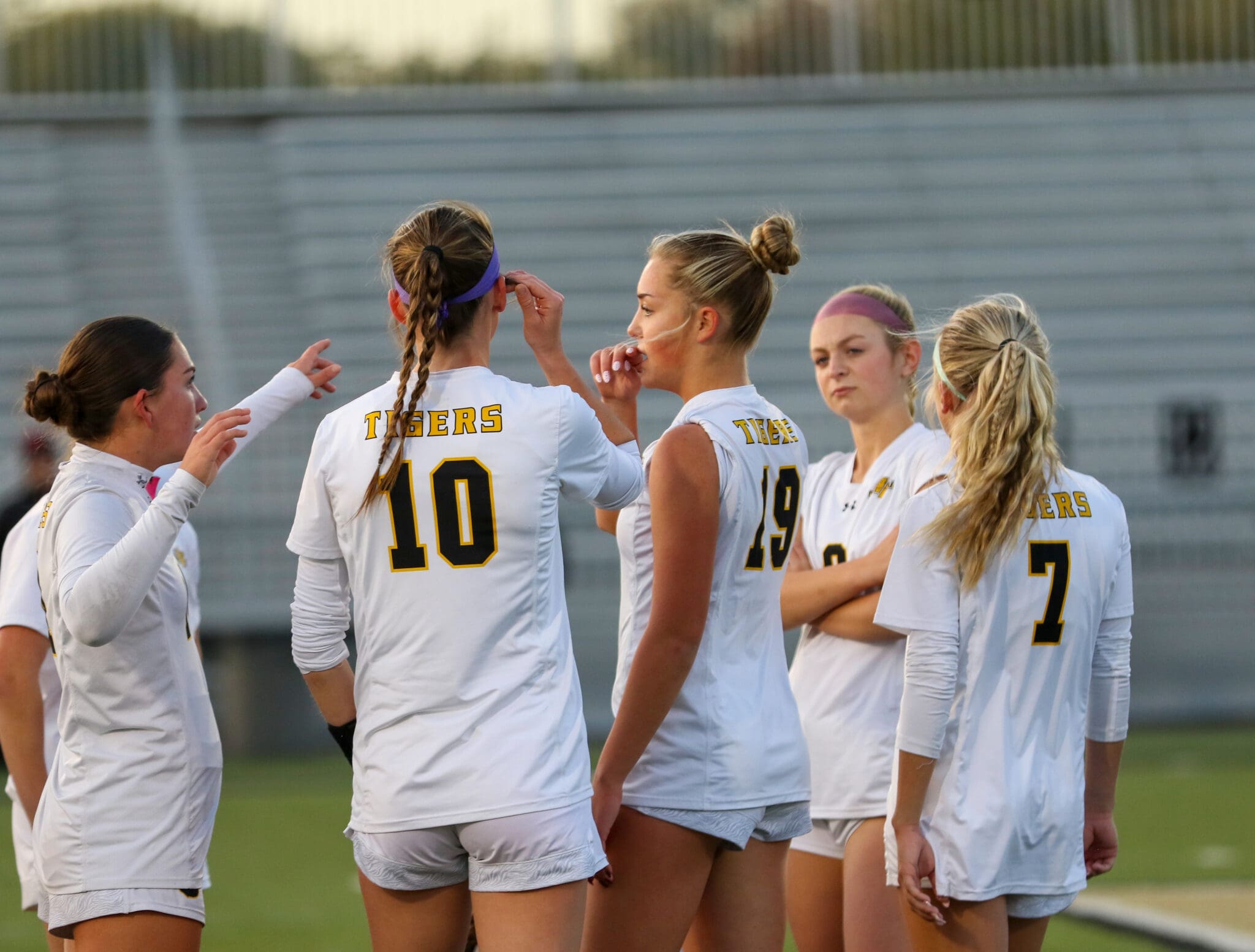 Soccer team in discussion on field during evening game, wearing numbered jerseys with Tigers on the back.