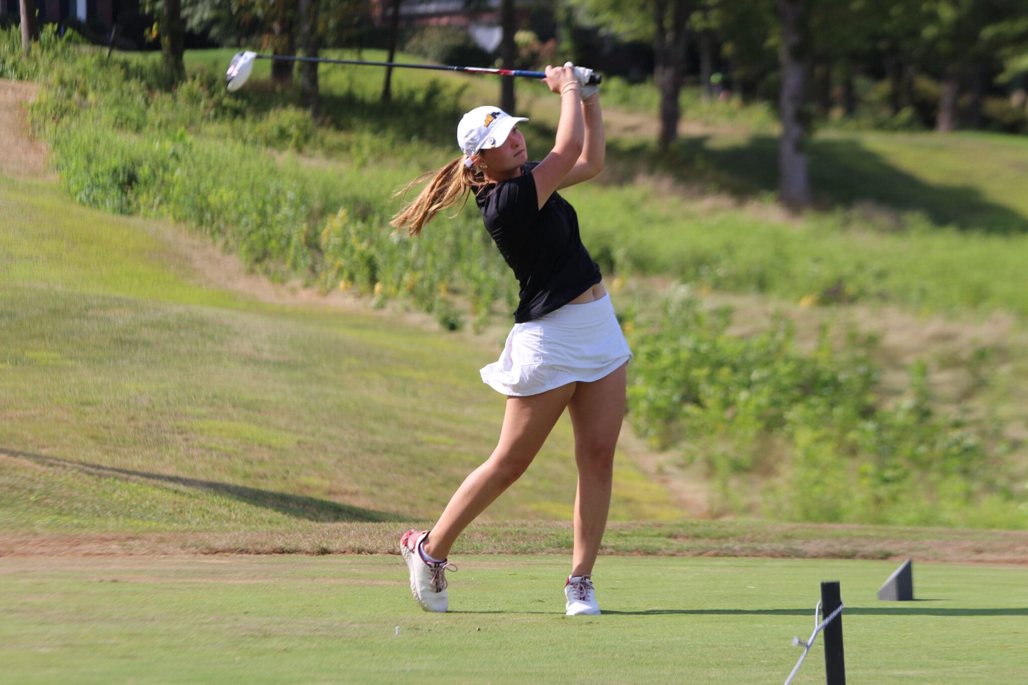 Golfer swings club on a sunny day, showcasing perfect form on green course.