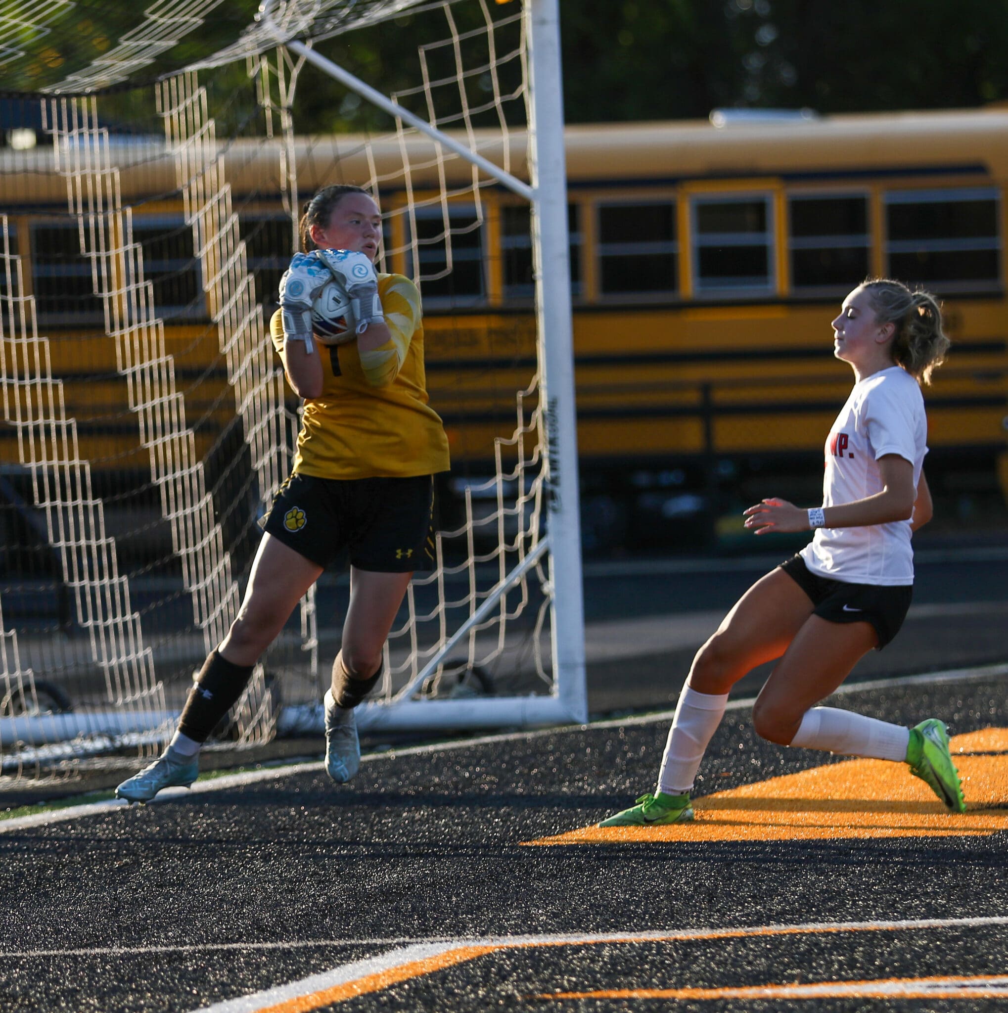 Soccer goalie catches ball during intense match, while opponent looks on.