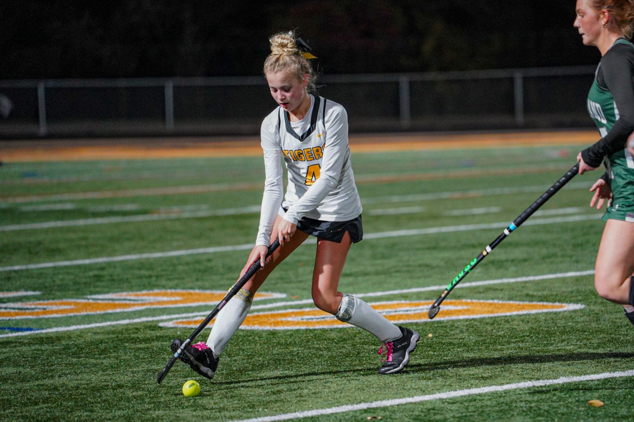 Field hockey player in action, dribbling the ball on a green turf field during a night match.