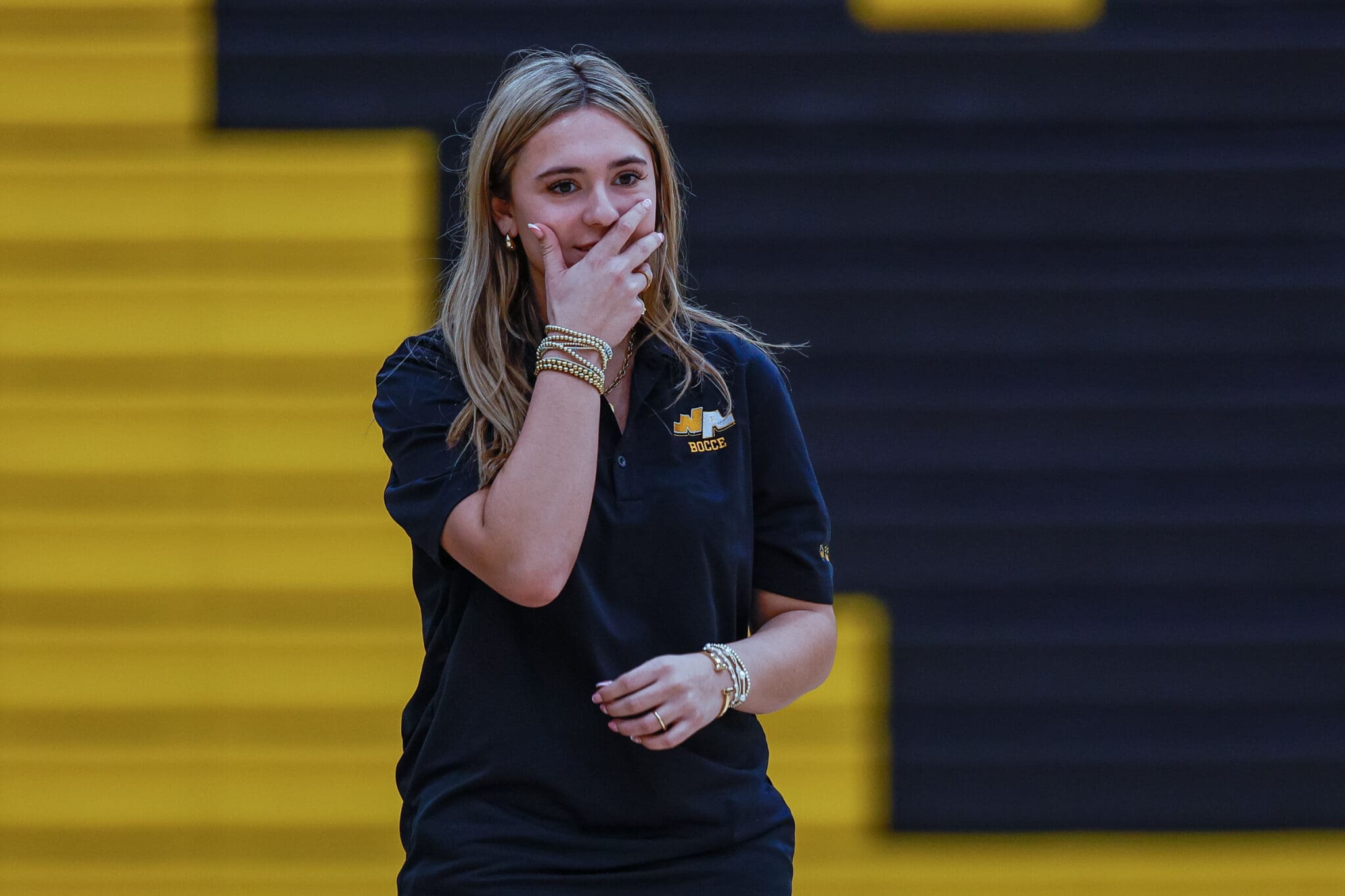 Young woman in black polo, hand on mouth, standing on yellow and black steps indoors.