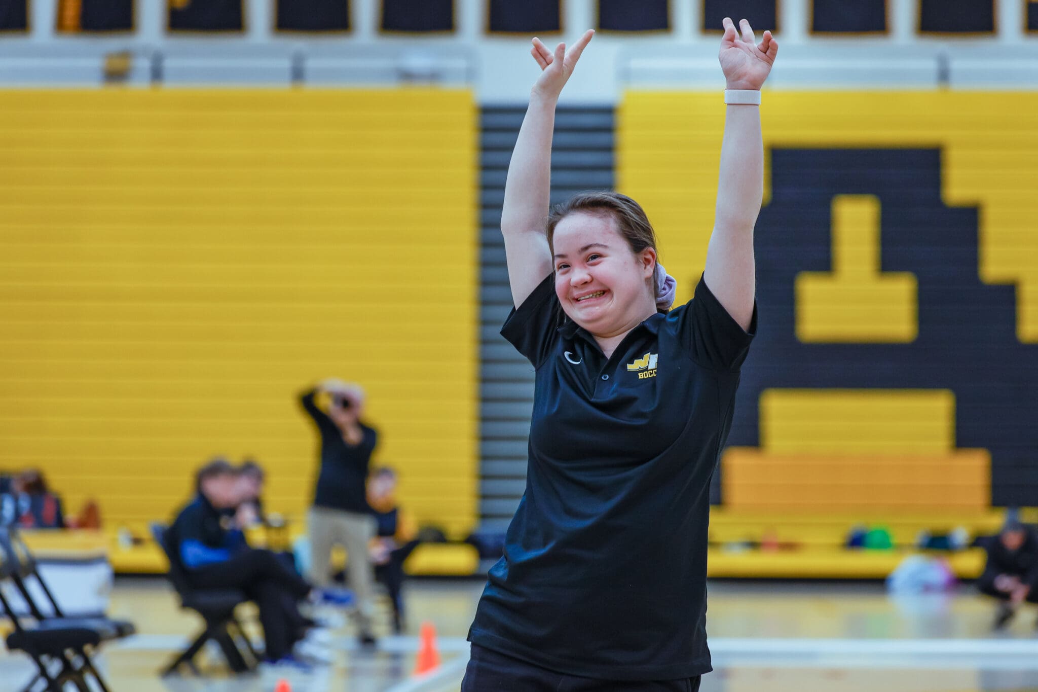 Woman in a black shirt smiling with arms raised in a gymnasium.