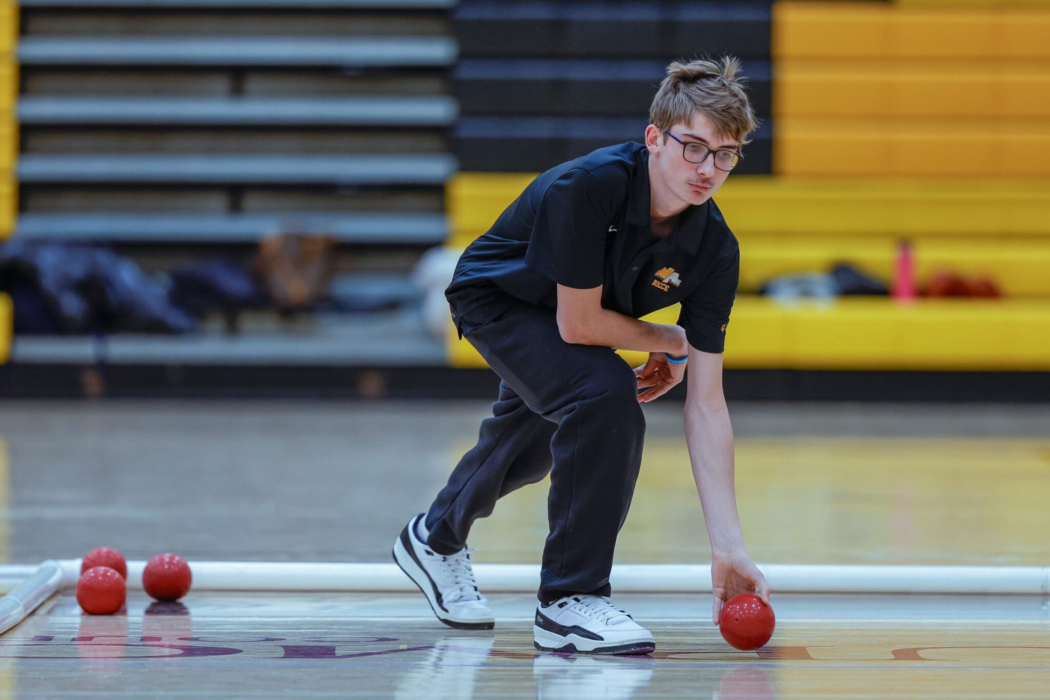 Person playing bocce ball indoors, preparing to roll a red ball with focus, sports background.