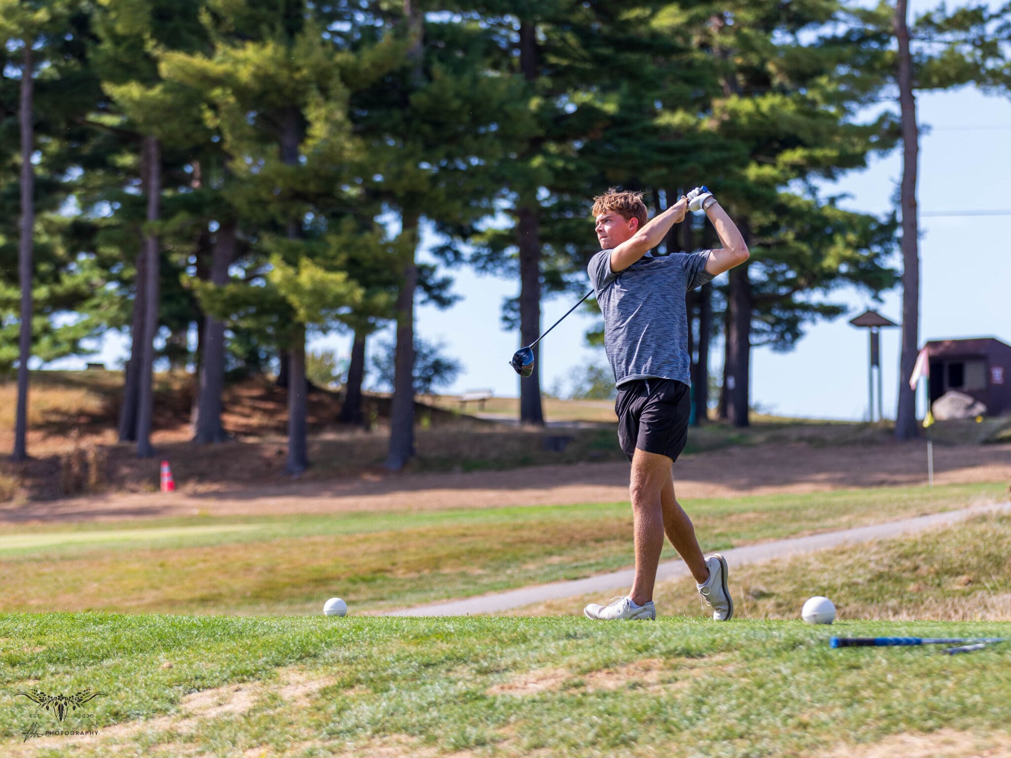 Golfer swinging club on green course, surrounded by tall trees on a sunny day.