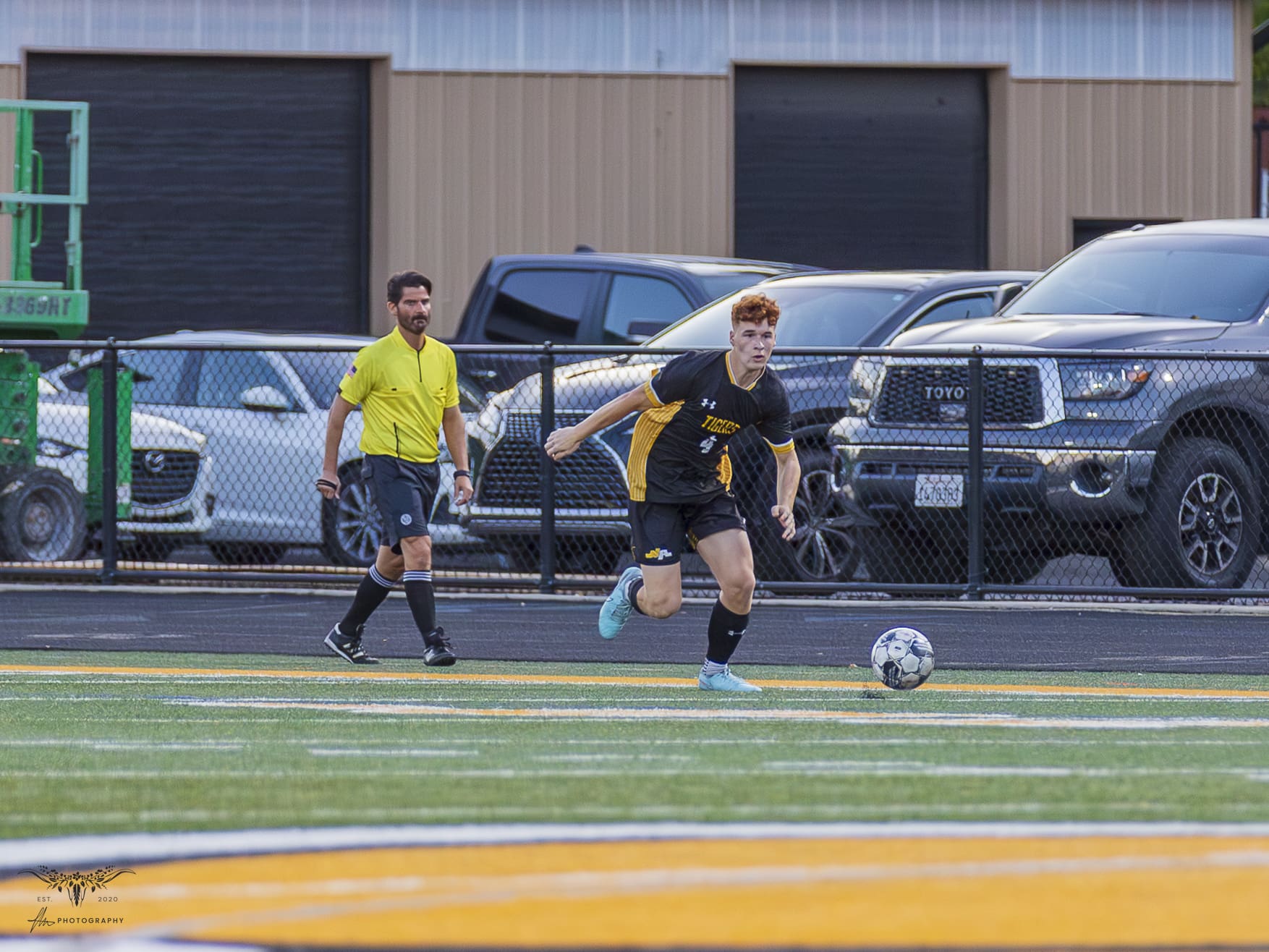 Soccer player dribbling the ball on a field as referee runs alongside.