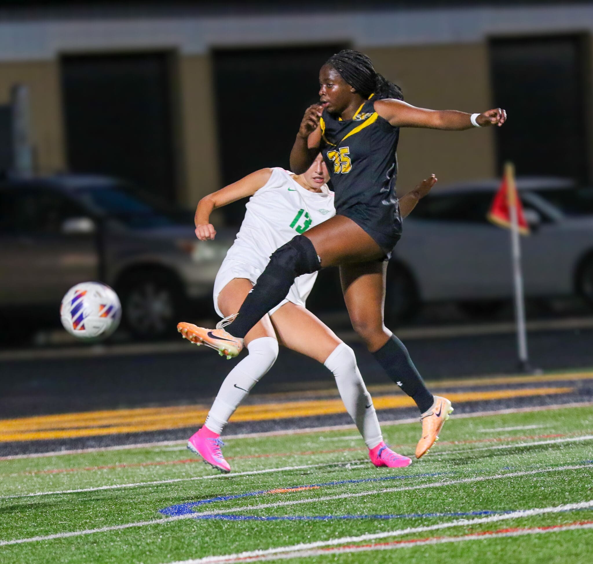 Two female soccer players compete for the ball in an intense night match on a well-lit field.