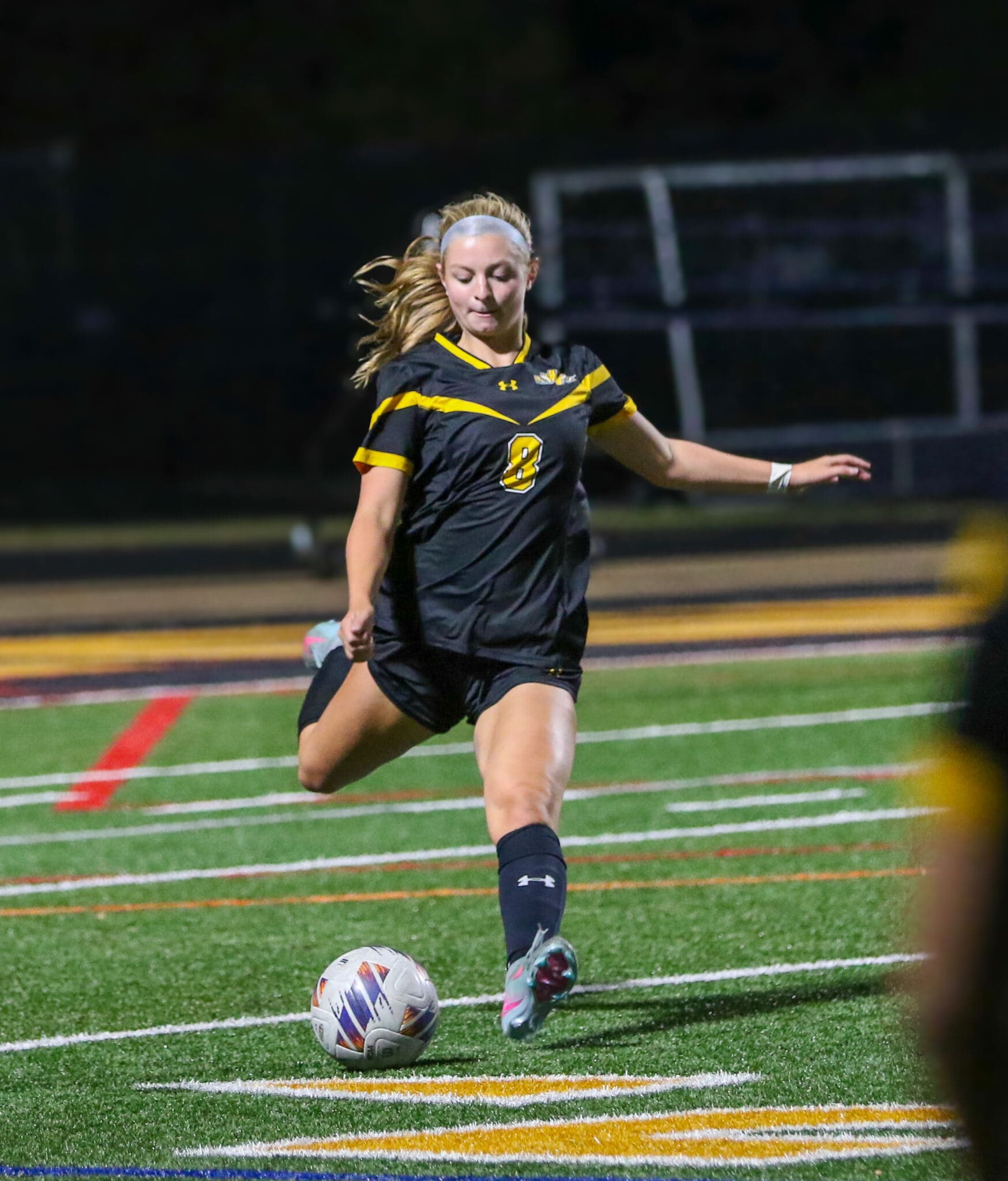 Soccer player in black and yellow uniform kicks the ball during a night match on a turf field.