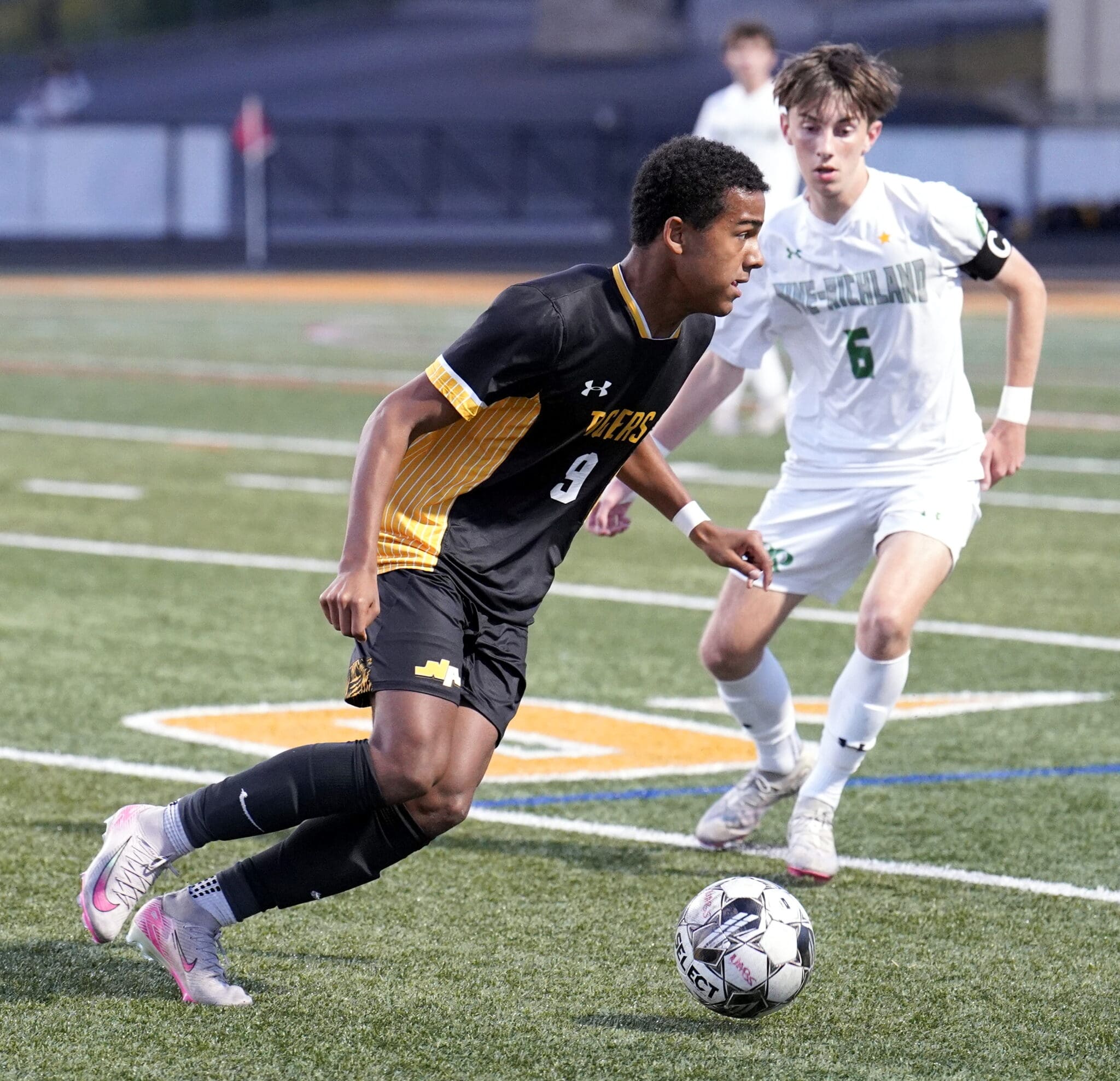 Soccer players in action on the field, one in black jersey and one in white, competing for the ball.