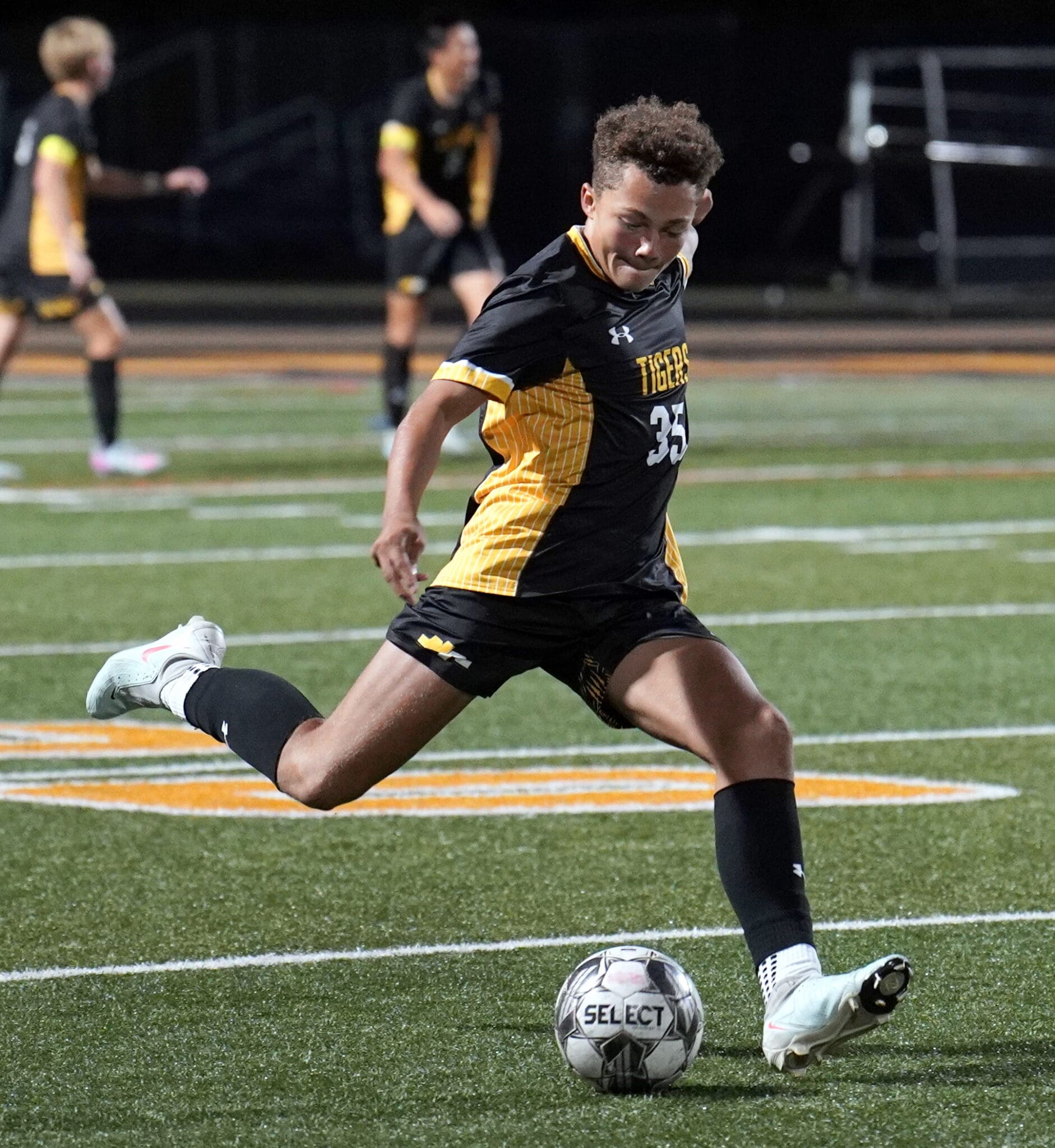 Soccer player in yellow and black uniform kicking ball on field during a night match.