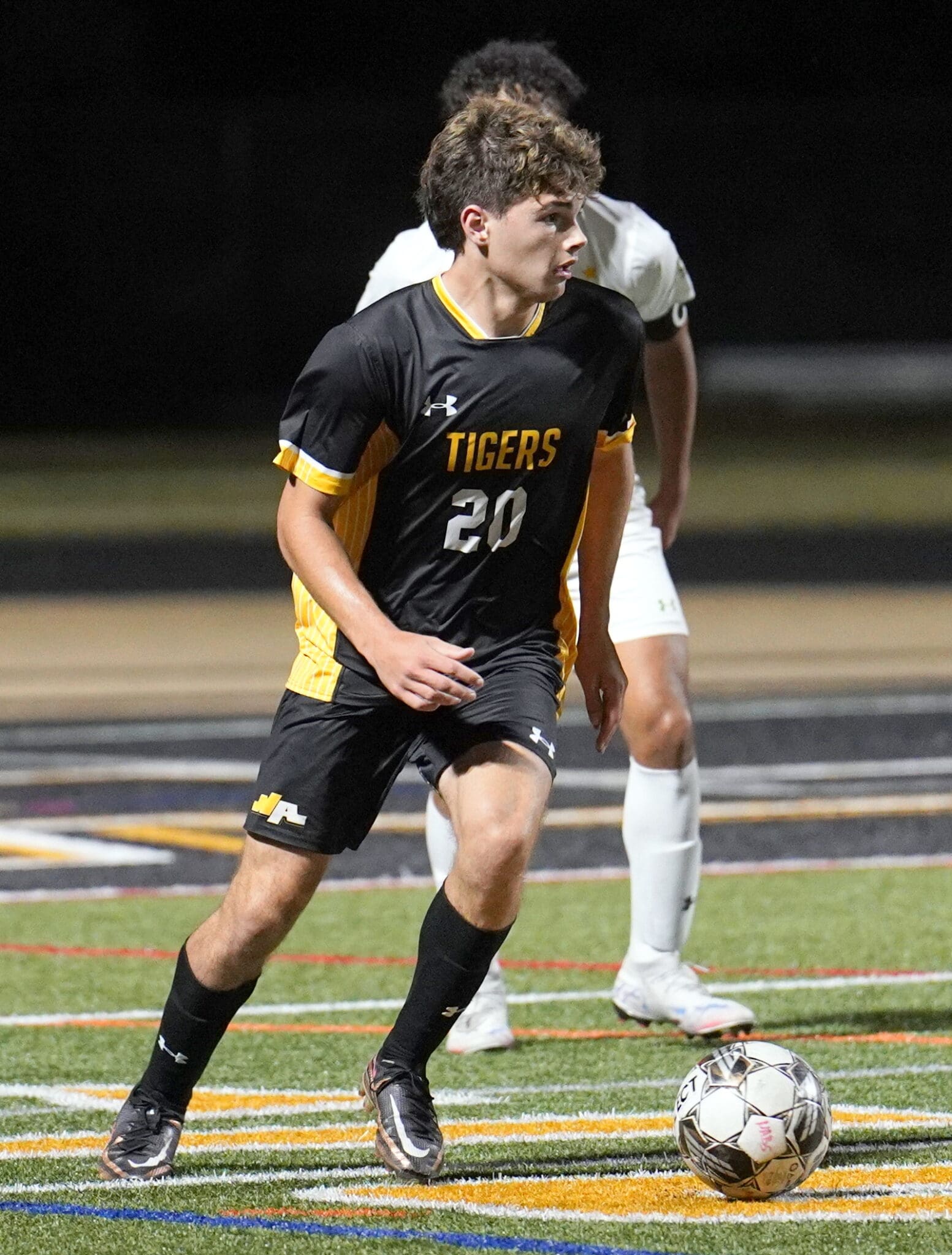 Soccer player in black and yellow Tigers uniform controlling the ball during a match on a lit field.