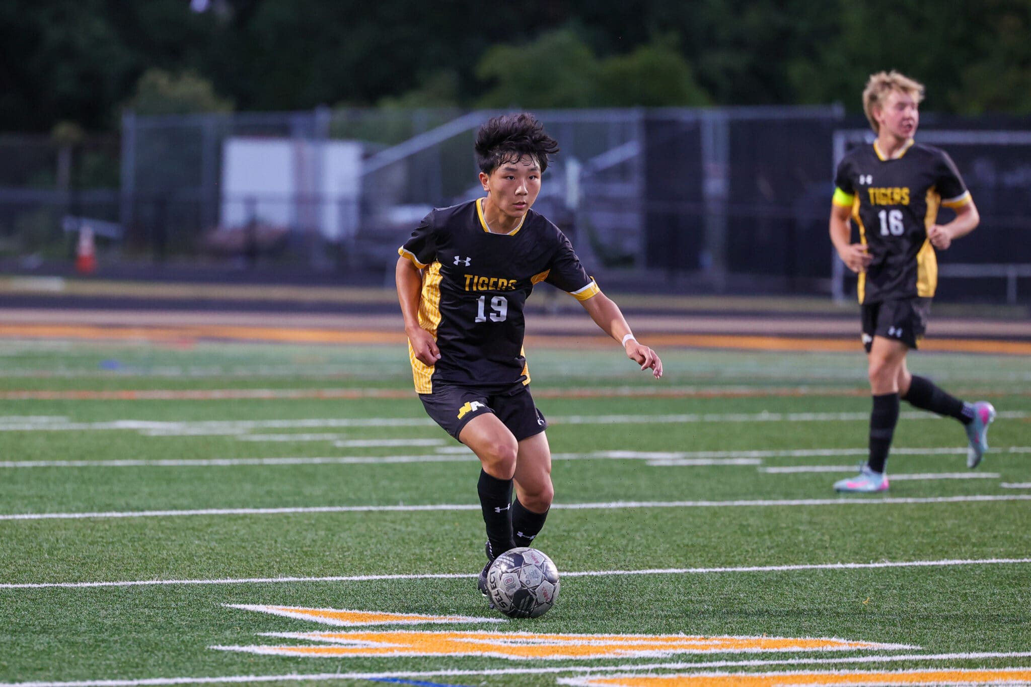 Soccer player in black and yellow uniform dribbling ball on green field during a match.