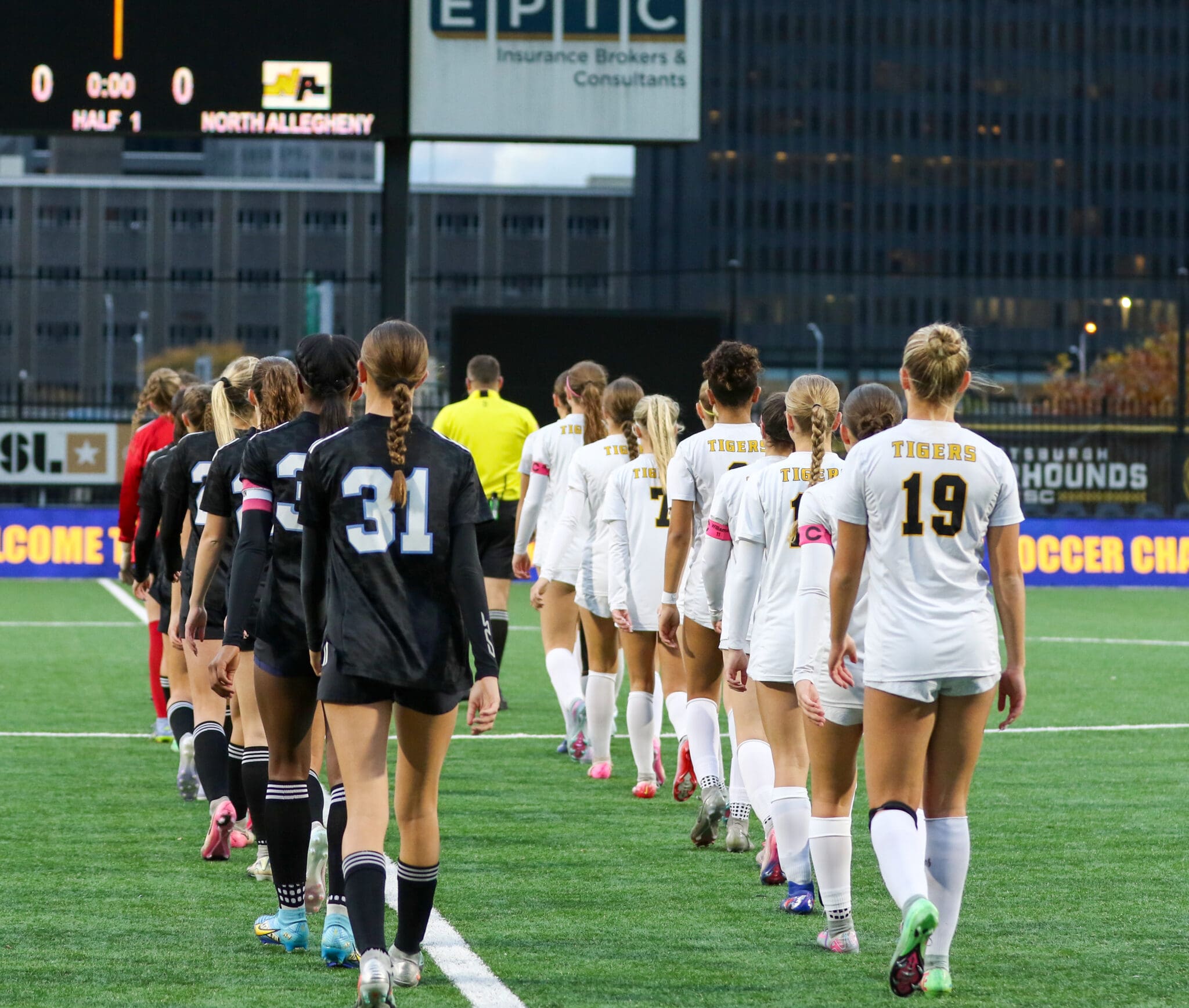 Two soccer teams walk onto the field before a match, one in black and the other in white.