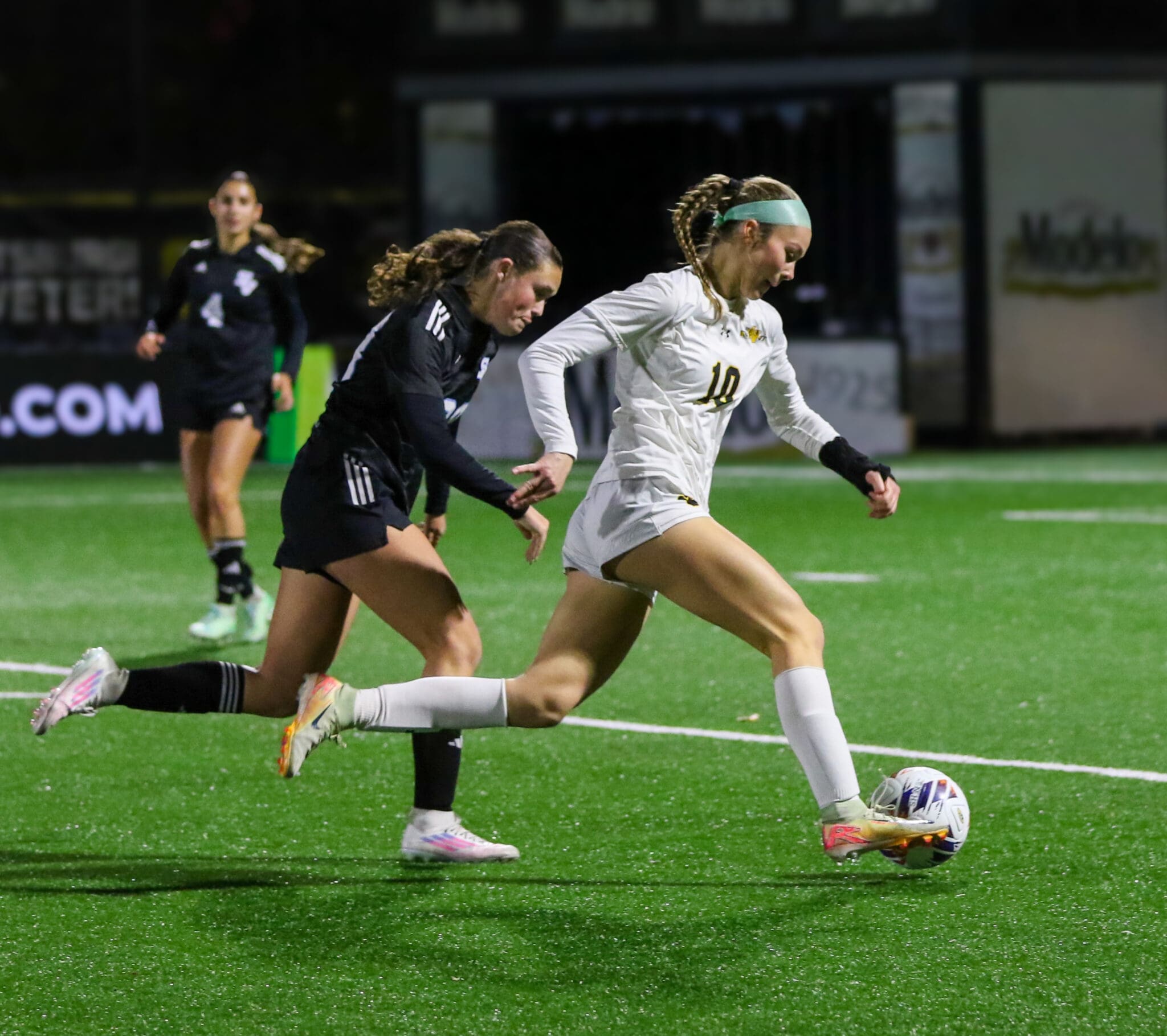 Soccer player in white dribbling past opponent on field during a night match.