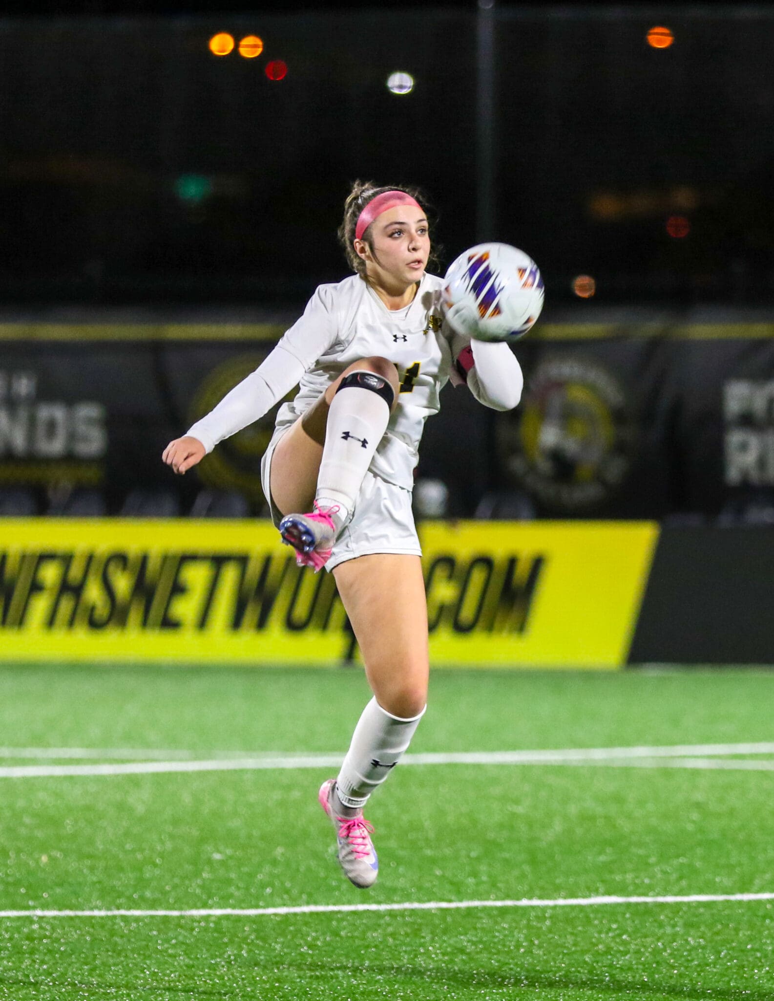 Soccer player in action, kicking ball mid-air on field at night game.
