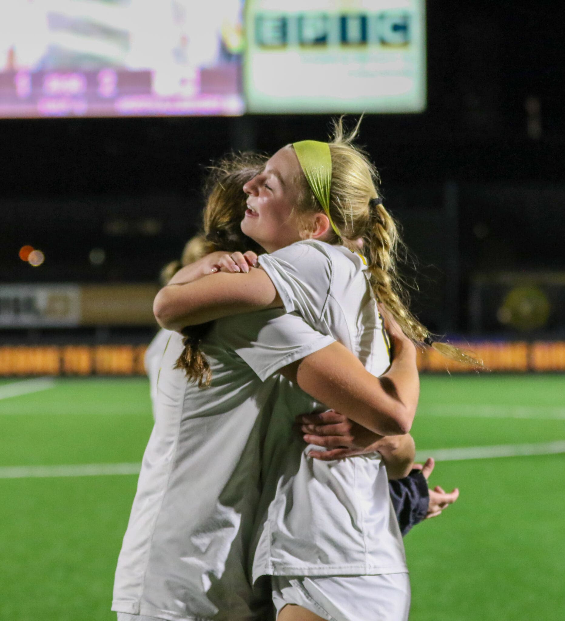 Two female soccer players joyfully embrace on the field, celebrating a victory under the stadium lights.