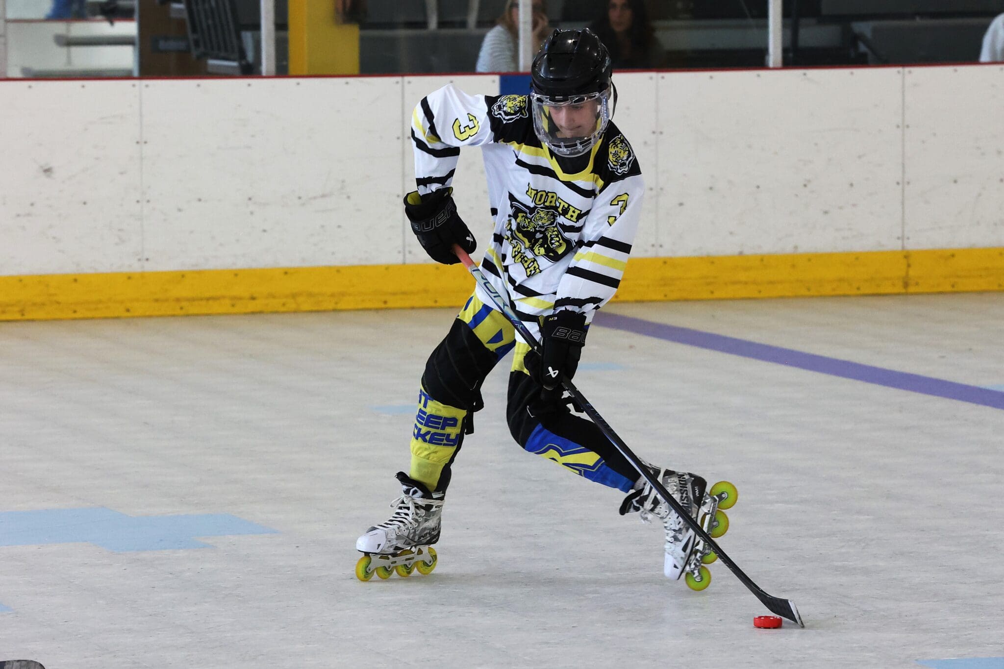 Inline hockey player in action, focused on controlling the puck indoors, wearing North Hockey gear.