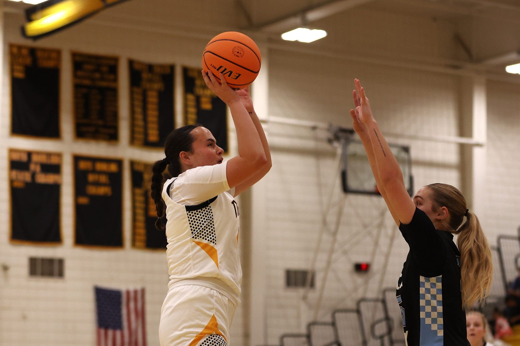 Basketball player in white jersey jumps to shoot, defended by player in black jersey in a gymnasium.