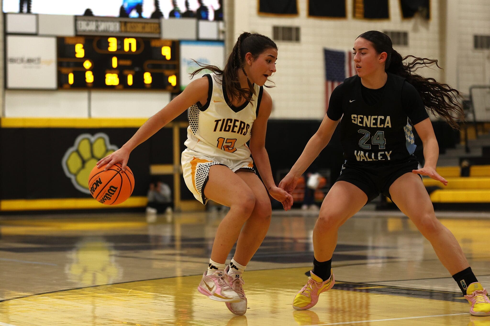 Two basketball players from rival teams in action on the court.