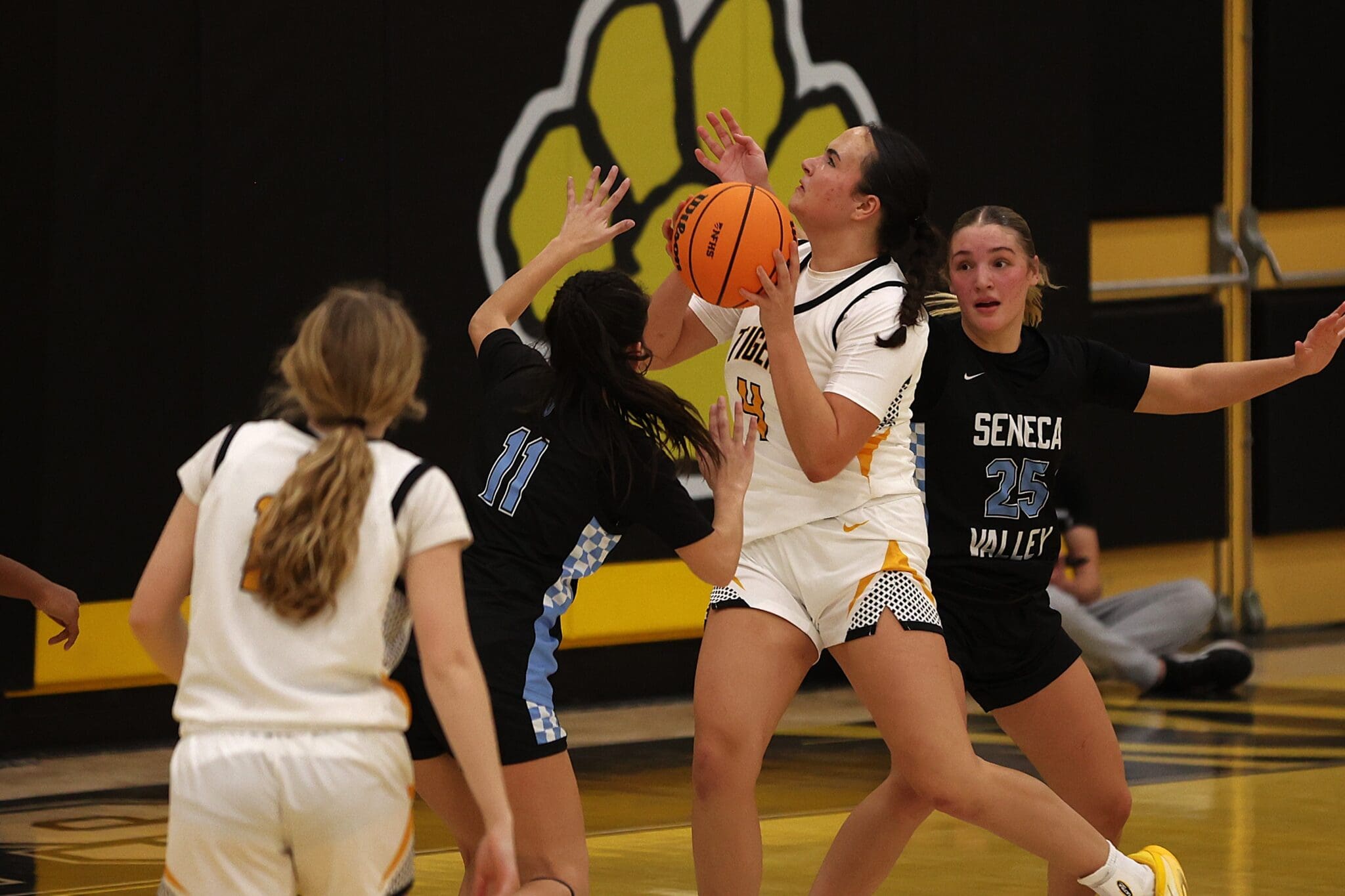 Girls' basketball game action with player in white holding ball, facing defenders in black jerseys on the court.