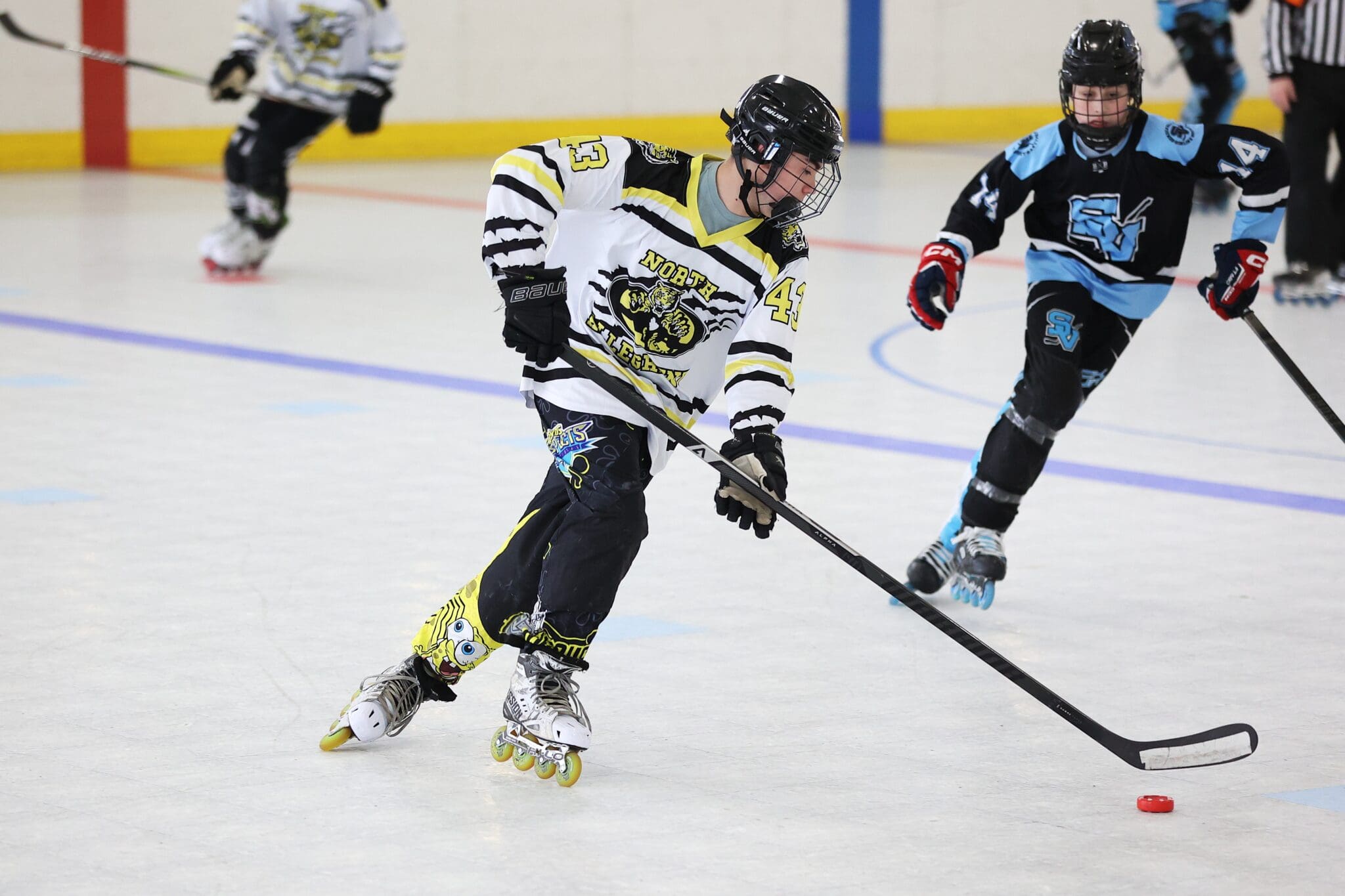 Youth roller hockey game, player in white jersey skating and controlling puck indoors.