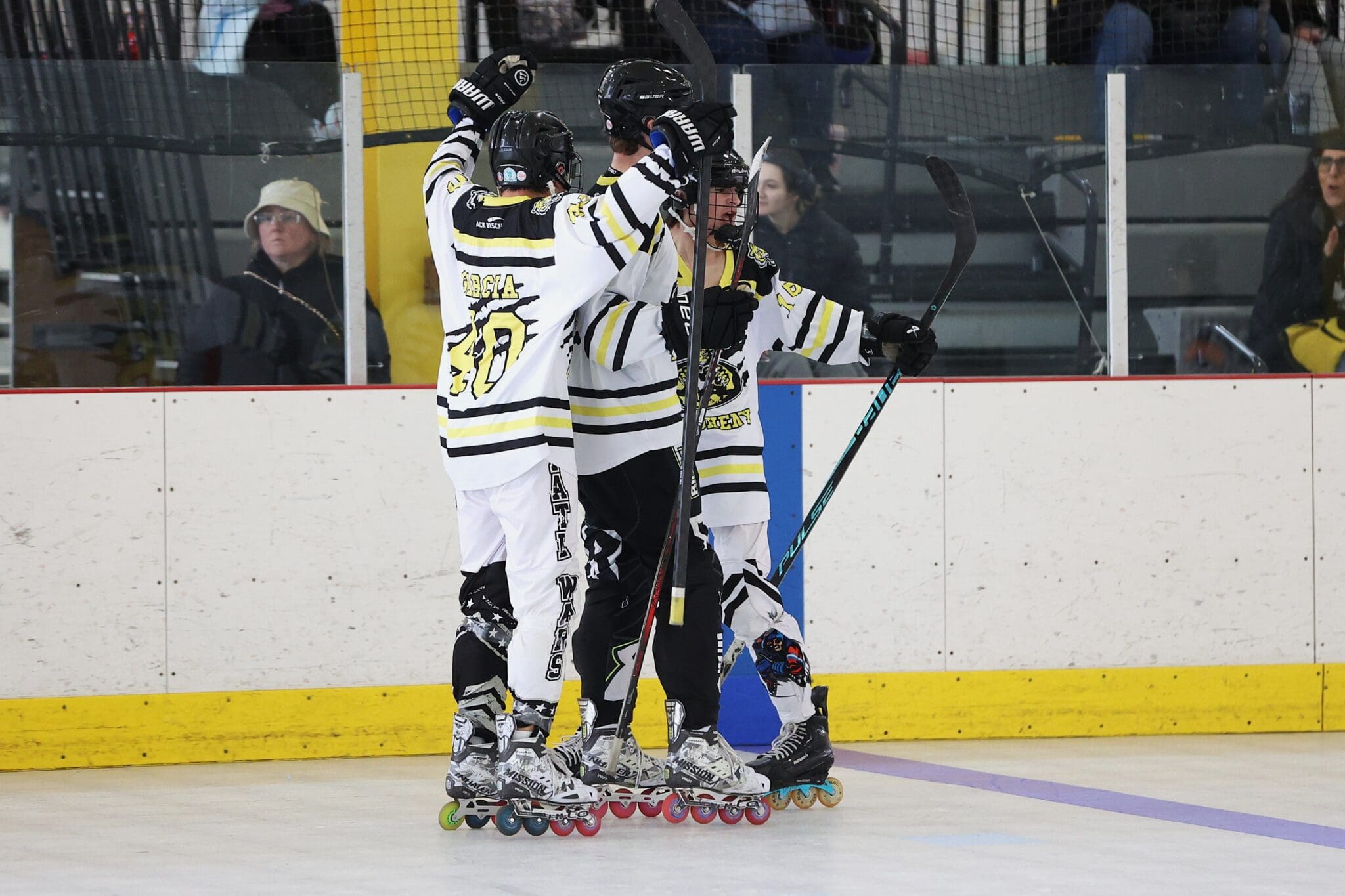 Roller hockey players celebrate goal, unified in a team embrace on the rink with cheering spectators in the background.