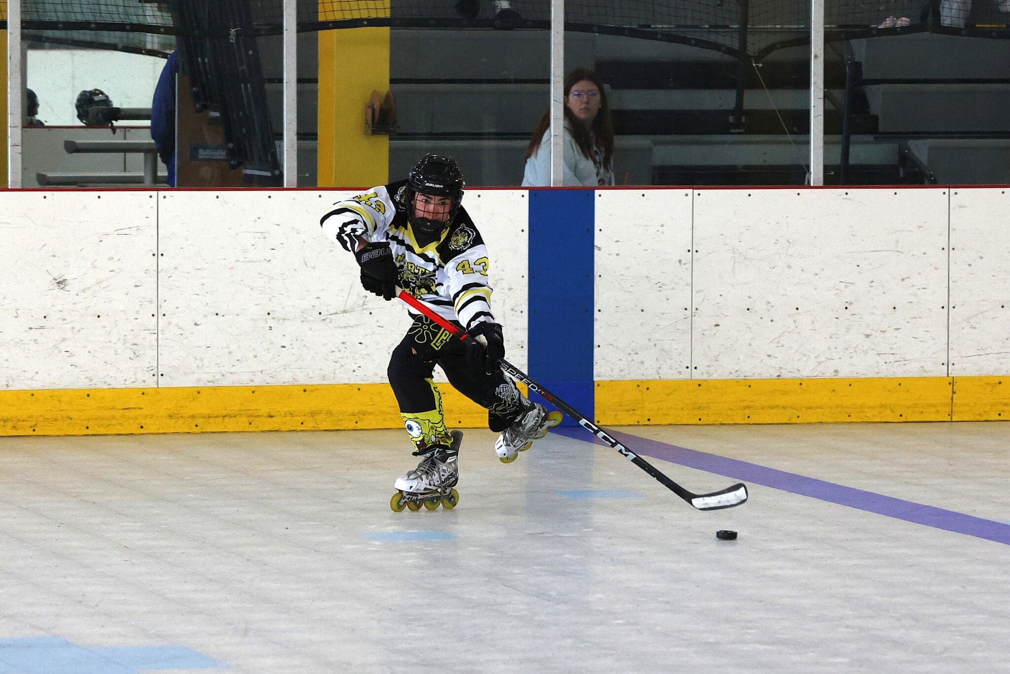 Roller hockey player in black and yellow uniform taking a shot on an indoor rink.