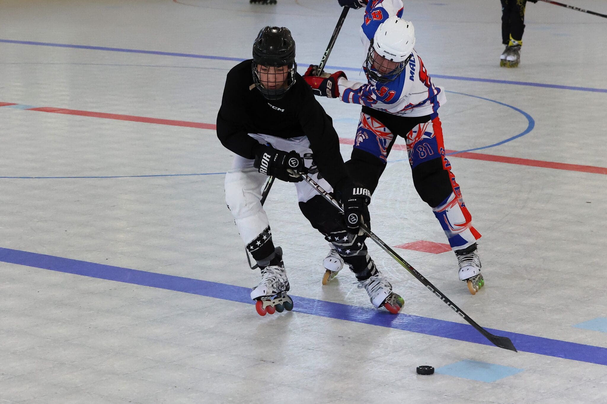 Inline hockey players in action on a rink, competing for the puck with intensity and skill.