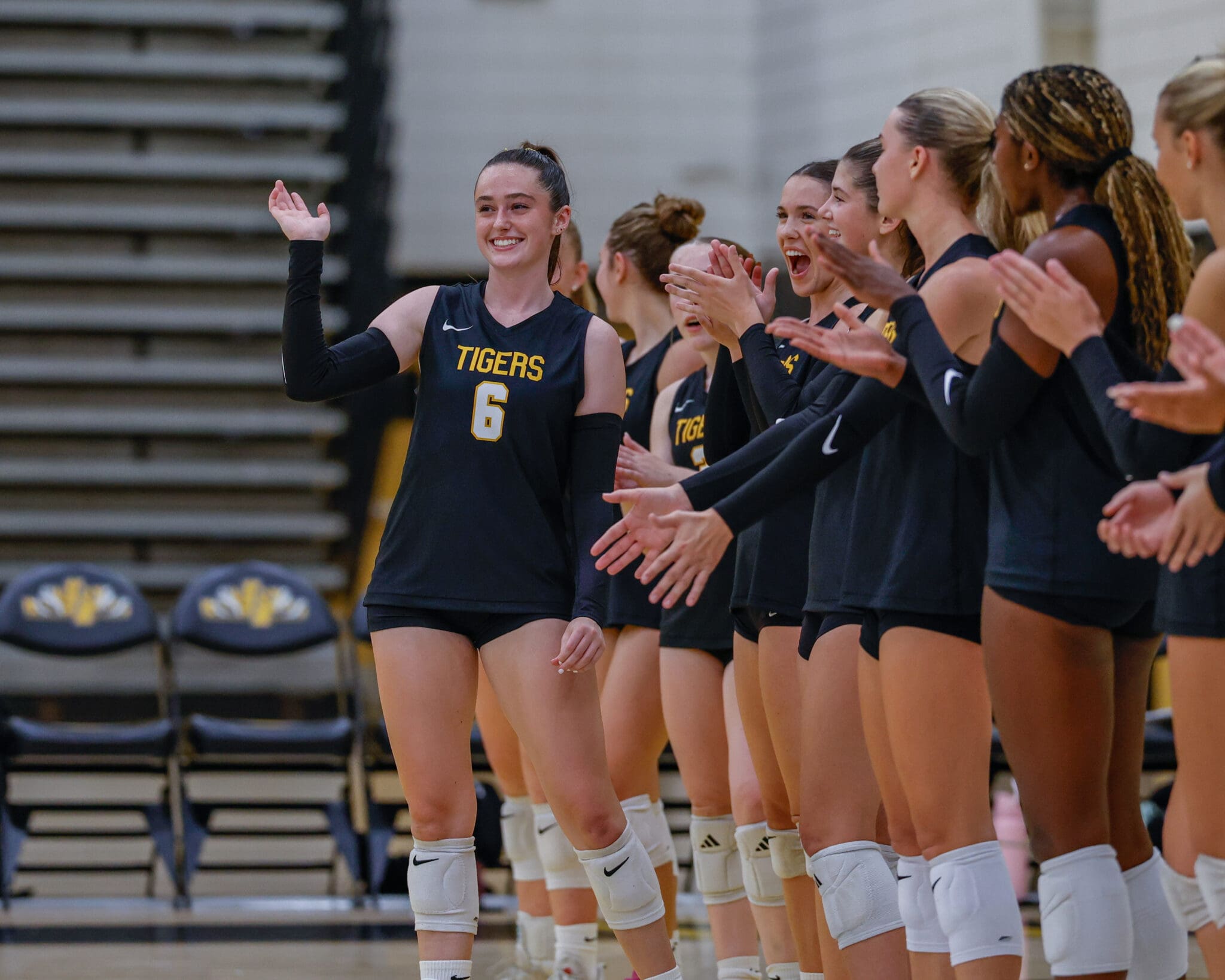 Volleyball team players in black uniforms clapping and celebrating on the court.