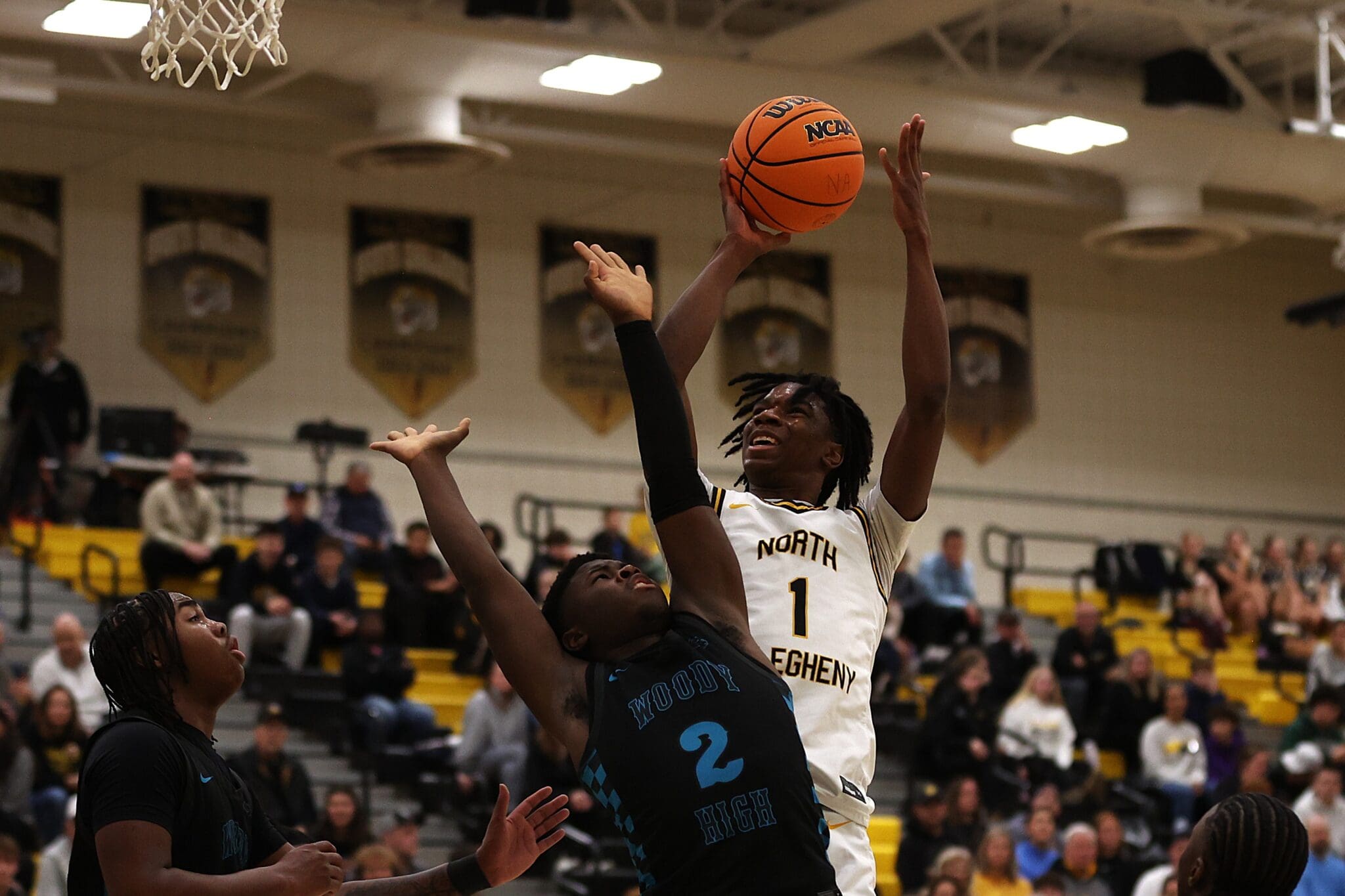 Basketball game: North Allegheny player shooting over Woody High opponent in a competitive match.