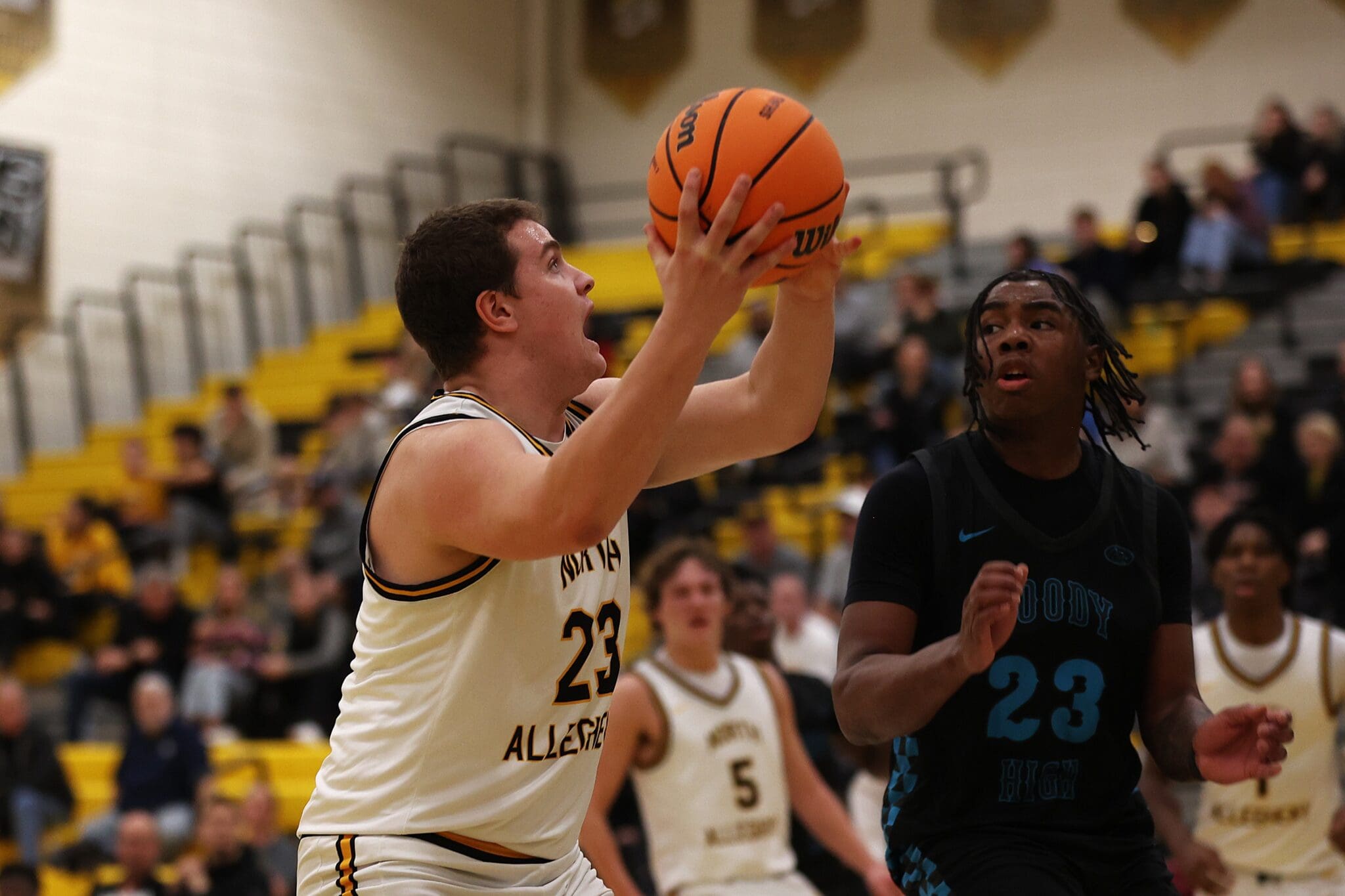 Basketball players in action during a high school game, with one preparing to shoot the ball.